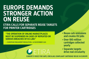 New RREUSE report reinforces ETIRA’s call for separate reuse targets for printer cartridges The European policy landscape is shifting in favour of reuse. A major new report from RREUSE, Targets...