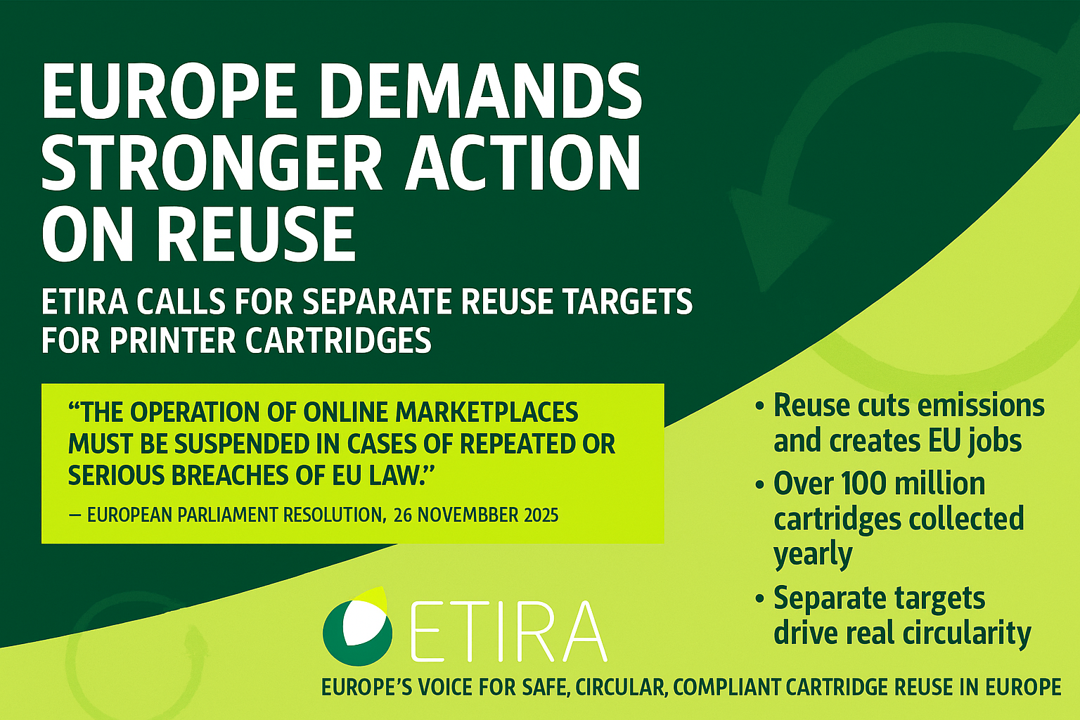New RREUSE report reinforces ETIRA’s call for separate reuse targets for printer cartridges The European policy landscape is shifting in favour of reuse. A major new report from RREUSE, Targets for Reuse and Preparing for Reuse in the European Union, provides strong evidence that Europe needs separate, binding reuse targets across key product streams. This […]
